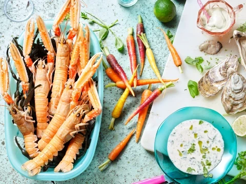 Kaisergranat, junge Möhren in Buttermilchvinaigrette und Austernmayonnaise